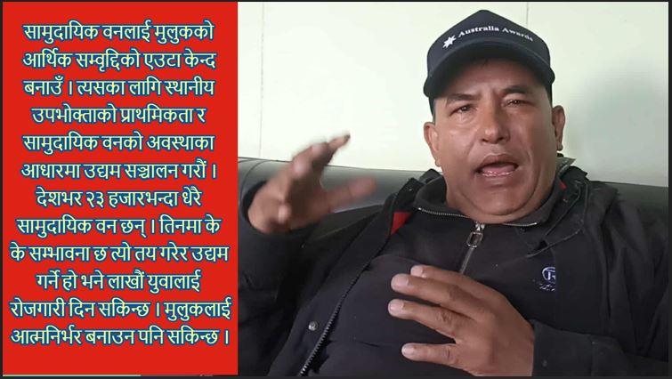 - सामुदायिक वन र उपभोक्तालाई स्वायत्त रुपमा काम गर्न सरकारले दिने हो भने देश विकास र आर्थिक सम्वृद्दिमा निकै धेरै गर्न सकिन्छ । वनको सही व्यवस्थापन हुँदा प्राकृतिक प्रकोपका घटना कम गर्न सहयोग पुगेको छ । सामाजिक रुपान्तरण, नेतृत्व विकासदेखि पूर्वाधार विकासमा सामुदायिक वन र उपभोक्ताकै कारण ठूलो फाइदा भएको छ । यो कुरालाई राज्यले मनन गरोस् । वनबाट कति राजश्व उठाउने भन्ने कोणबाट मात्रै हेरियो भने वातावरणीय सेवाको मुल्य कति हुन्छ त्यो पनि भन्नुपर्ला । त्यसैले सामुदायिक वन र उपभोक्ता समूहहरुलाई सहज र स्वायत्त रुपमा काम गर्न सरकारले थप सहजीकरण गर्नुपर्छ । सामुदायिक वनलाई राजश्व उठाउने कोणबाट भन्दा पनि जीवनपद्दतीका रुपमा स्वीकार्नु आवश्यक छ । तीन तहका सरकारको अधिकार क्षेत्र र ऐन नियममा विरोधाभाष छ त्यो हटाइनुपर्छ । समुदाय र सामुदायिक वनलाई स्वतन्त्र रुपमा काम गर्न दिने हो भने विकास र सम्वृद्दिमा टेवा पुग्ने निश्चित छ । सरकारले यसबारे बेलैमा सोच्नुपर्छ । सरकारको शासकीय मनस्थितिलाई परिवर्तन गर्नु आजको आवश्यकता हो । शासकीय सोचभन्दा सेवकको सोच राखेर सरकार अघि बढ्ने हो भने सामुदायिक वनबाट कायापलट गर्न सकिन्छ ।