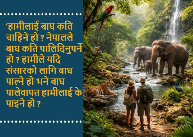 नेपालले संसारको लागि बाघ पाल्दा के फाइदा भइरहेको छ ? भन्दै प्रश्न गर्दै उहाँले भन्नुभयो, ‘हामीलाई बाघ कति चाहिने हो ? नेपालले बाघ कति पालिदिनुपर्ने हो ? हामीले यदि संसारको लागि बाघ पाल्ने हो भने बाघ पालेवापत हामीलाई के पाइने हो ? होइन भने हामीले बाघ पाल्ने त्यो बाघले हाम्रै मान्छे खाइदिने तर हामीले त्यसको रोकथाम पनि गर्न नसक्ने ?