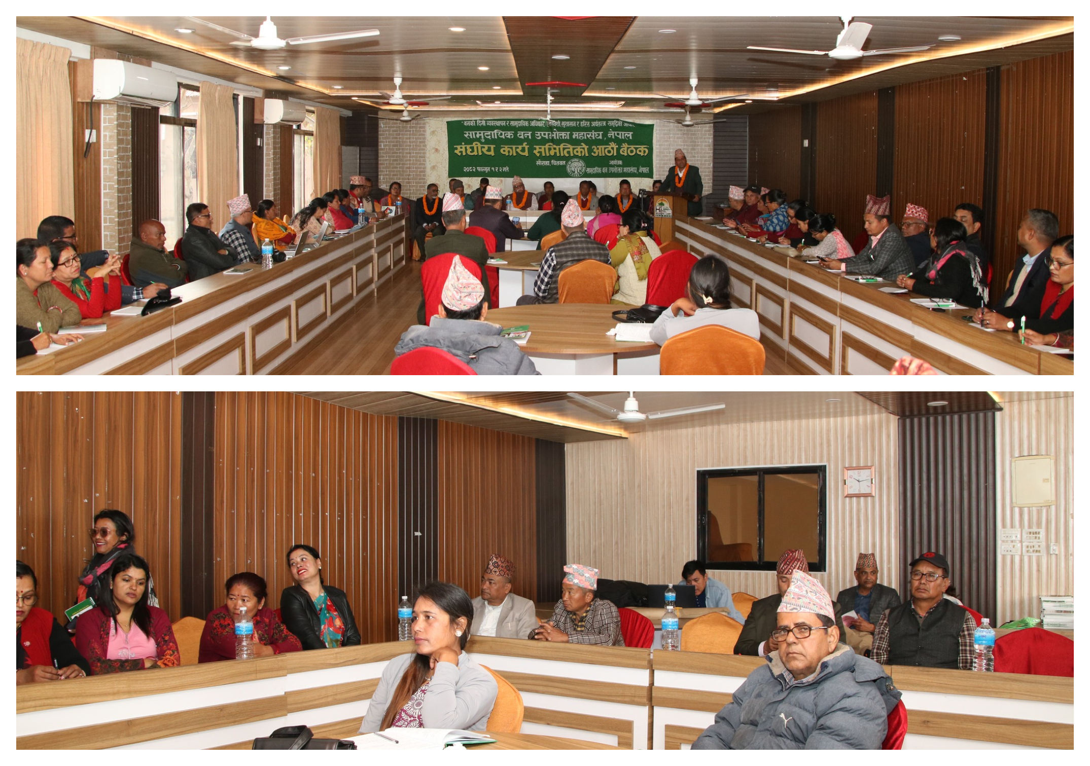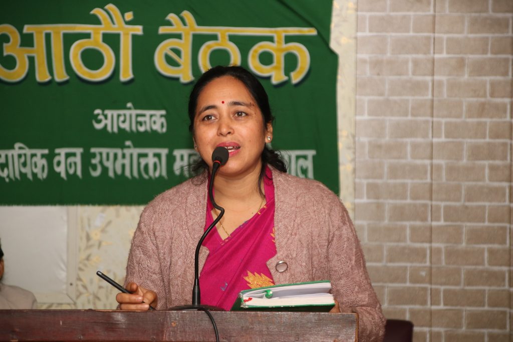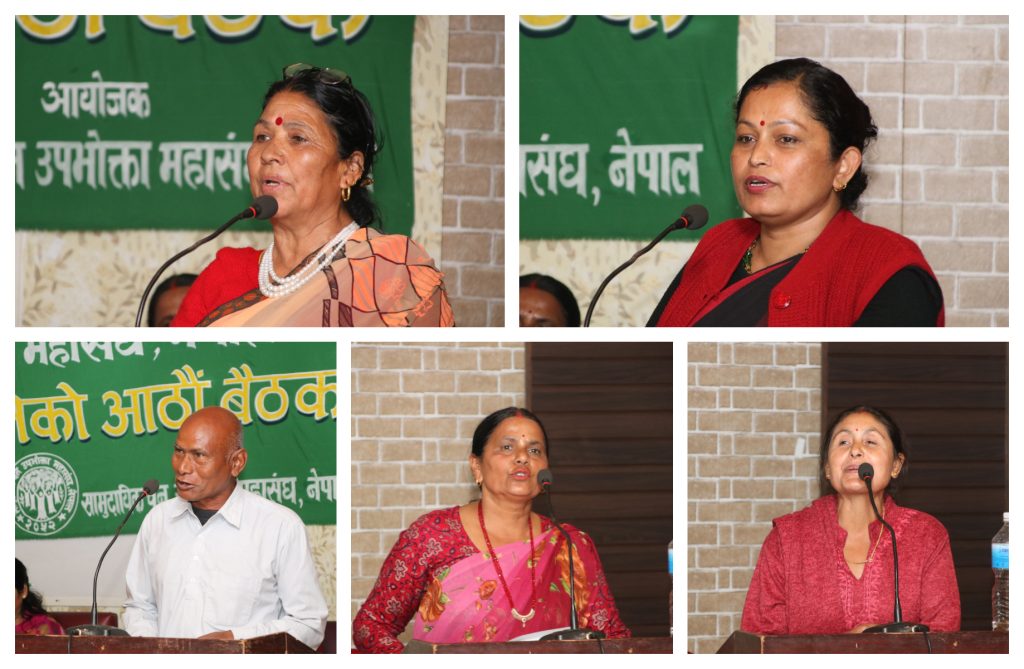 यसका अलावा बैठकमा स्वदेशी काठमा आत्मनिर्भरताका लागि चाल्नुपर्ने कदम, भौतिक पूर्वधार निर्माण र नाफामुलक क्षेत्रको तिव्र प्रभाव, मानव–वन्यजन्तु द्वन्द्वको सम्बोधन, उपभोक्ता समूहमा लैङ्गिक समानता र सामाजिक न्यायसहित यूवा नेतृत्वको सुनिश्चतताका लागि अवलम्बन गर्नुपर्ने उपायहरु जस्ता विषयहरुमा छलफल गरिएको थियो । युवा समुदायमा सामुदायिक वनका माध्यमबाट वनको दिगो व्यवस्थापन गर्दै स्वदेशमा नै रोजगारी र जीविकोपार्जन सृजना गर्न सकिन्छ भन्ने कुराको विश्वास जगाउने प्रतिवद्धता सहित सम्पन भएको आठौँ बैठकबाट १५ बुँदे घोषणापत्र जारी गरिएको महासचिव पार्वता गौतमले जानकारी दिनुभयो ।