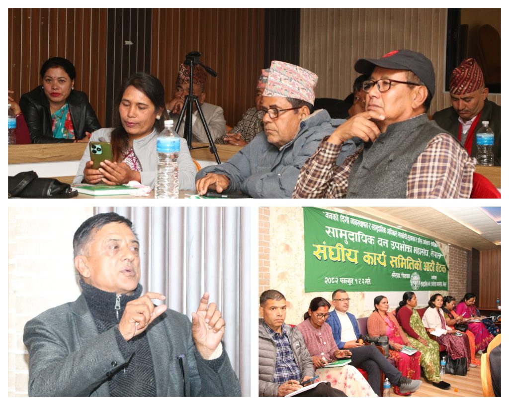 काठमाडौं । सामुदायिक वन उपभोक्ता महासंघ नेपालको संघीय कार्यसमितिको आठौं बैठक चितवनमा सम्पन्न भयो । दुईदिनसम्म चलेको बैठकले प्रतिनिधि सभाको निर्वाचनमा भाग लिएका सम्पूर्ण राजनीतिक दलहरुले वनमाथिको समुदायको अधिकारको सुनिश्चितताका लागि आ–आफ्नो घोषणापत्रमा सामुदायिक वन अभियानलाई उच्च महत्व दिने प्रतिवद्धता जनाउनुपर्ने निष्कर्ष निकालेको छ ।