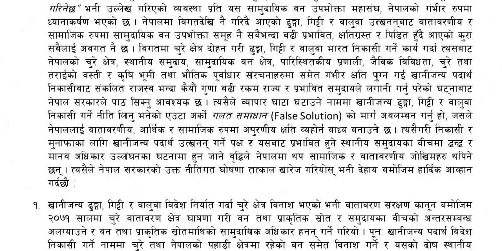 ढुङ्गा, गिट्टी,बालुवा उत्खनन् र निकासीको घोषणा खारेज गर्न फेकोफनको माग